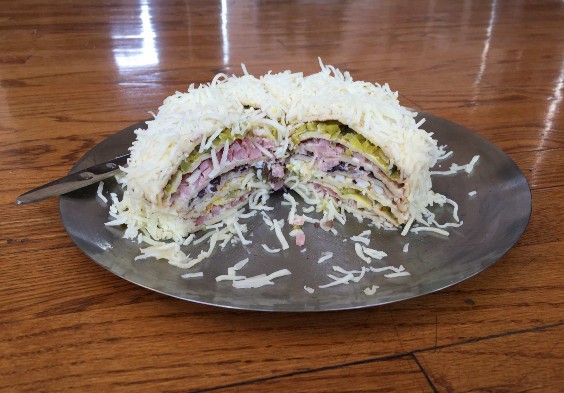 Continue in the same fashion alternating different ingredients-olives, hard boiled eggs, ham, pickles. Spread mayo on each crepe and on the sides of the cake. Top generously with shredded cheese.